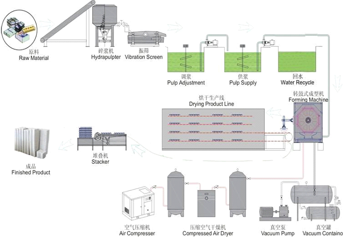 2-成型系統(tǒng):轉鼓式成型機,模具,空壓機,空壓機罐,真空泵,真空罐,高壓水泵,汽水分離泵等。